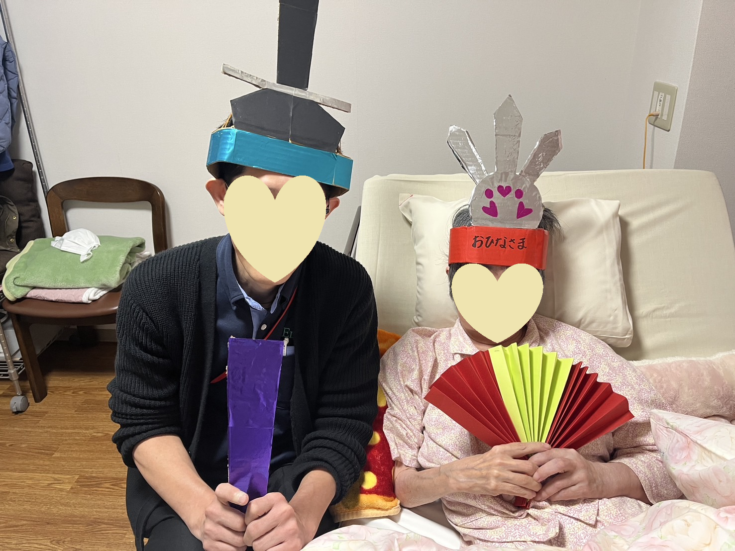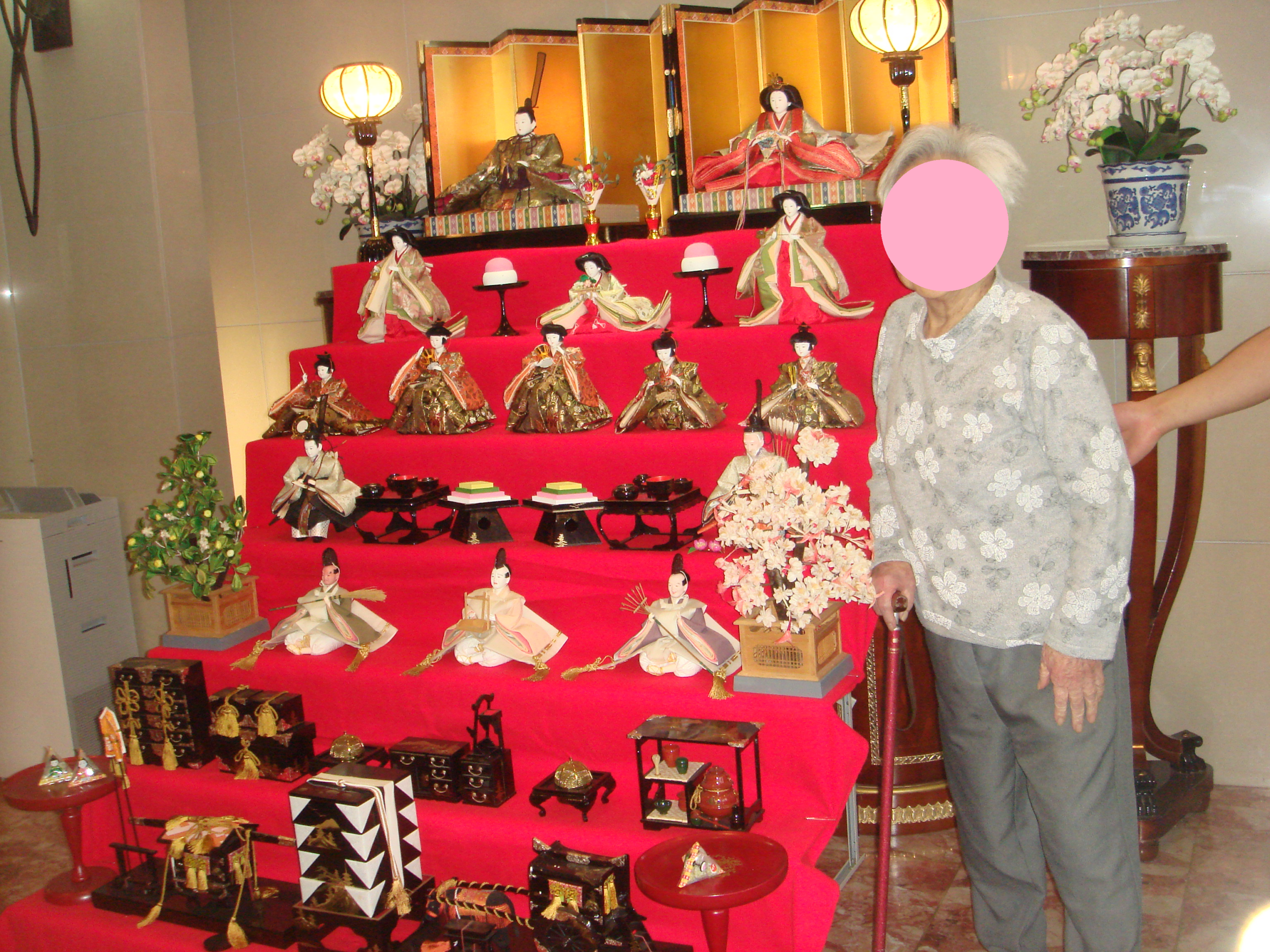「明かりをつけましょ、ぼんぼりに~」とフロアではレクリエーションの時間に楽しい歌声が聞こえます。玄関前に飾られたお雛様の前で写真をとったり「子供の頃大きな段飾りを蔵にしまってあってひな祭り前にだしてもらうのが楽しみだったの」と懐かしいお話もしてくださいます。
