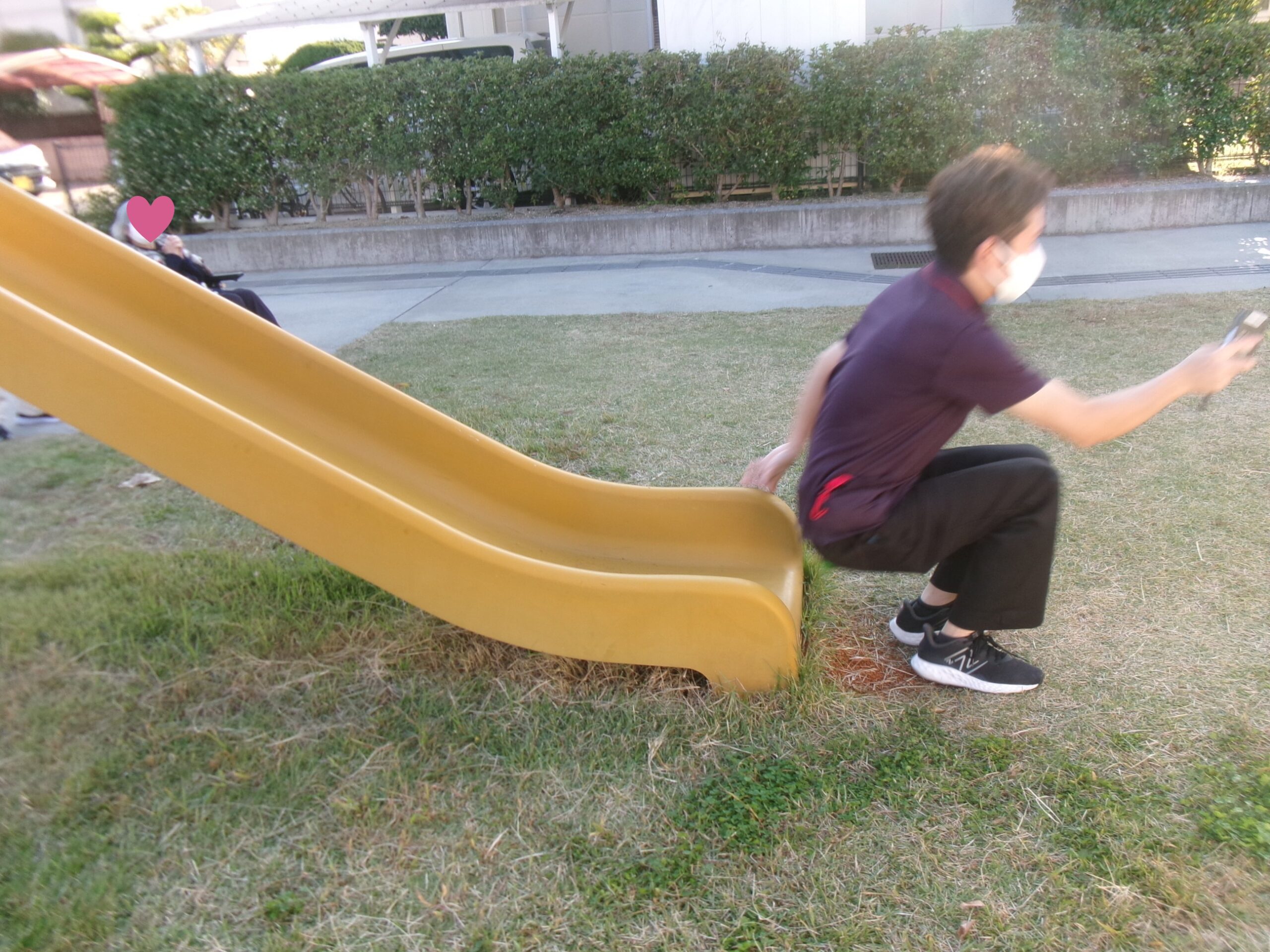 職員がすべり台で滑ってるのを笑っておられるご入居者様。