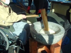 日が照った午前中、良い陽気の中利用者様皆様おもちをつきに集まってくれました。